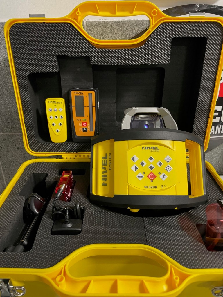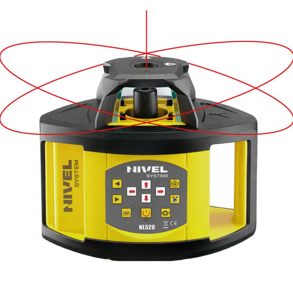Laser obrotowy Nivel System NL520 to wszechstronne i wielofunkcyjne narzędzie do realizacji prac wewnątrz pomieszczeń (z widoczną, czerwoną wiązką lasera), jak i na otwartych przestrzeniach (z wykorzystaniem czujnika). Instrument wyznacza płaszczyznę poziomą, pochyloną, pionową (po obróceniu go o 90°), a także, dzięki pionownikowi, określa pion lub kąty proste. NL520 przeznaczony jest do prac ogólnobudowlanych. Jego mocną strona jest trwałość i odporność na warunki atmosferyczne oraz wydajne akumulatorki litowo-jonowe zapewniające kilkadziesiąt godzin ciągłej pracy w terenie. Sprzęt jest przyjazny użytkownikowi dzięki intuicyjnemu interfejsowi i możliwości zdalnej obsługi za pomocą pilota.